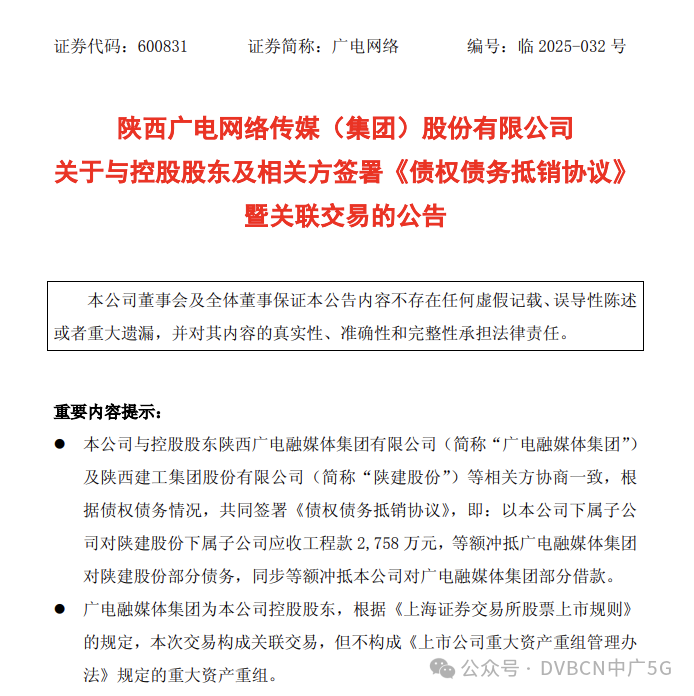 2025年12月2日,陜西廣電網(wǎng)絡(luò)發(fā)布公告,宣布與控股股東陜西廣電融媒體集團有限公司(簡稱“廣電融媒體集團”)、陜西建工集團股份有限公司(簡稱“陜建股份”)等相關(guān)方簽署《債權(quán)債務(wù)抵銷協(xié)議》。此次交易構(gòu)成關(guān)聯(lián)交?