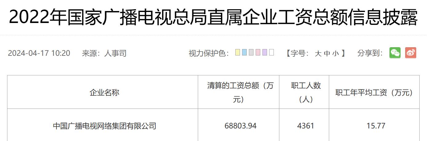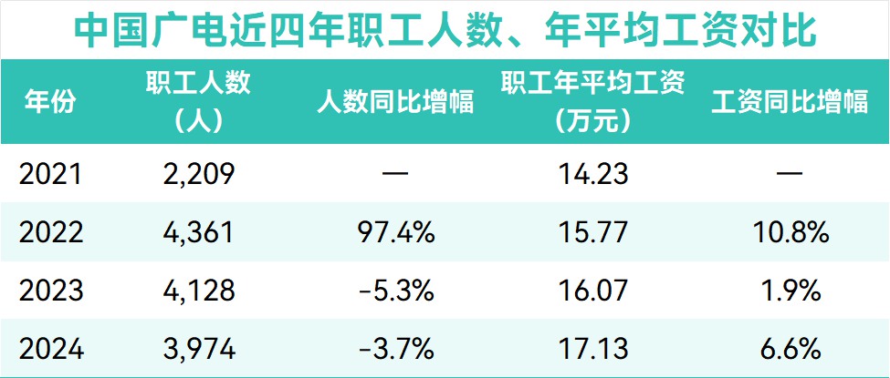 近四年來,中國廣電職工平均工資穩(wěn)步增長。據(jù)國家廣播電視總局統(tǒng)一披露的直屬企業(yè)工資信息數(shù)據(jù),中國廣電的年平均工資從2021年的14.23萬元增至2024年的17.13萬元,累計漲幅達(dá)20.38%。